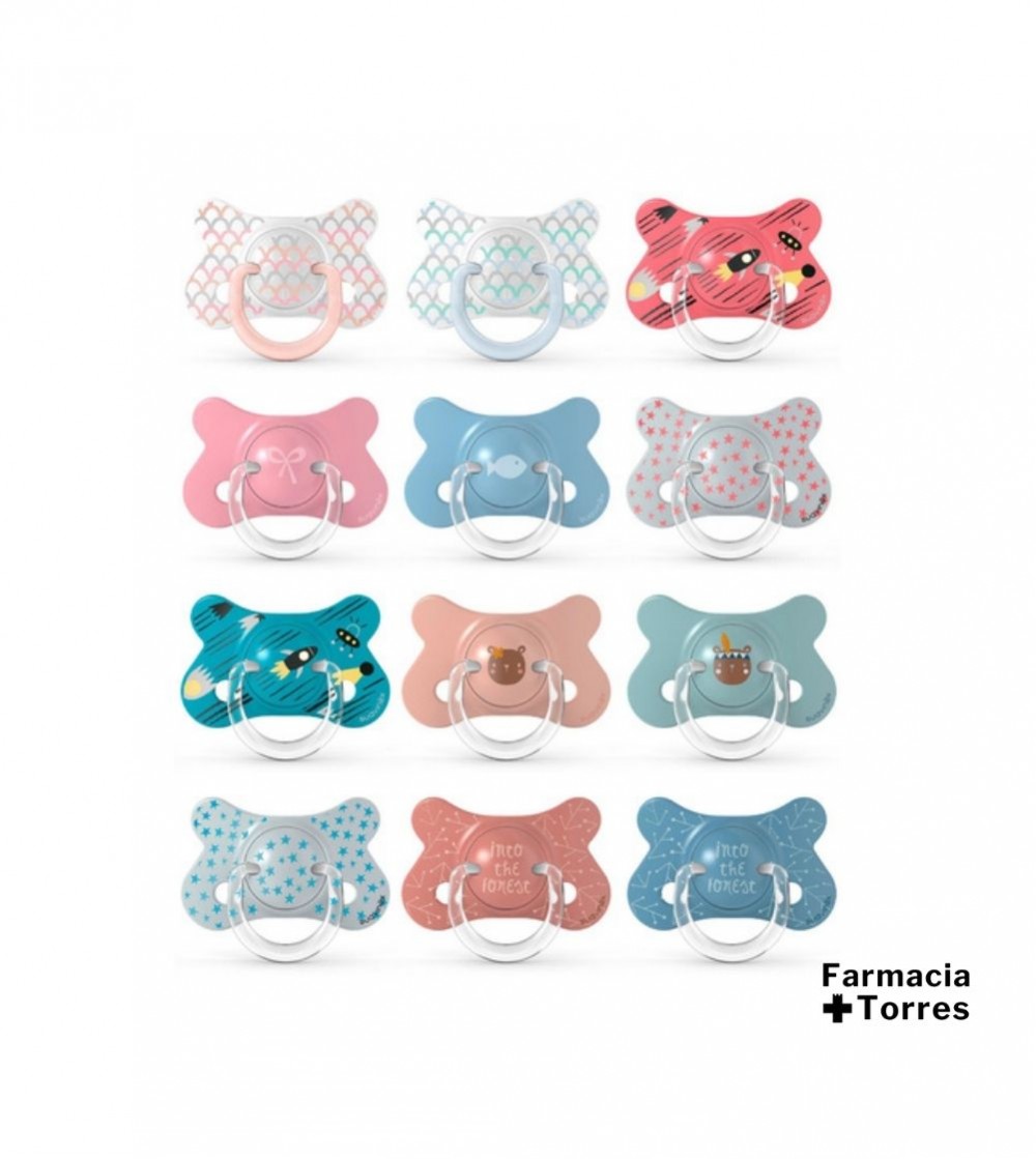 La tetina fisiológica, más estrecha y plana en la base, permite que el chupete quede bien colocado en la boca del bebé, ejerciendo la mínima presión sobre el paladar. La tetina anatómica imita la forma del pezón materno durante la succión y se adapta perfectamente al paladar del bebé.